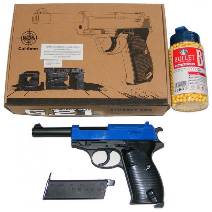 The Galaxy G21 Spring Powered Metal BB Gun Pistol, is a powerful, all metal plastic gun with a metal magazine which holds 14 BB pellets.  1:1 Scale Replica of the Walther P38.  Velocity:  280 FPS.  Colour:  Blue and Black.    Dimensions:  22.0cm (L) x 13.7cm (H) x 3.2cm (W).  Weight:  580g.  2000 BB Pellets Included.  This is an excellent quality BB Gun Pistol.  All Spring Powered BB Gun needs to be cocked before each pellet can be fired.   Please be aware that this is a very powerful BB Gun, please be extra careful when using this item.  Eye Protection should be worn at all times.