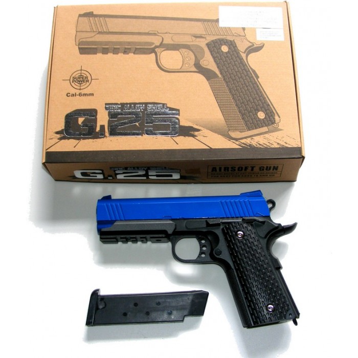 The G25 Spring Powered Metal BB Gun Pistol, is a powerful, all metal gun with excellent detail.  It has a plastic magazine that holds a maximum of 15 plastic BB pellets.  Velocity:  290 FPS.  Colour:  Blue + Black.  Dimensions:  20.5cm (L) x 14.5cm (H) x 3.3cm (W).  Weight:  580g.  A Small Packet of approximately 50 BB Pellets are included with this item.    This is an excellent quality BB Gun Pistol.  All Spring Powered BB Gun needs to be cocked before each pellet can be fired.   Please be aware that this is a very powerful BB Gun, please be extra careful when using this item.  Eye Protection should be worn at all times.